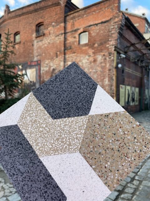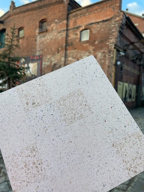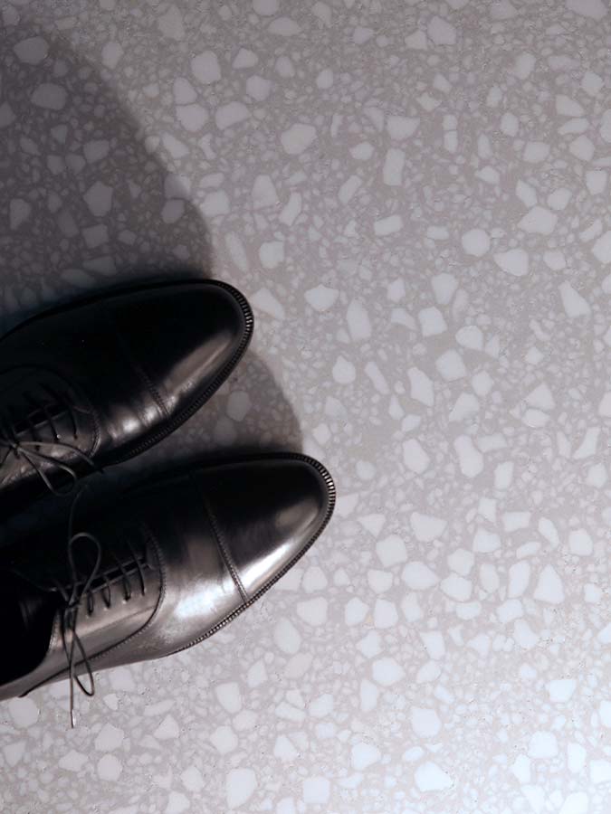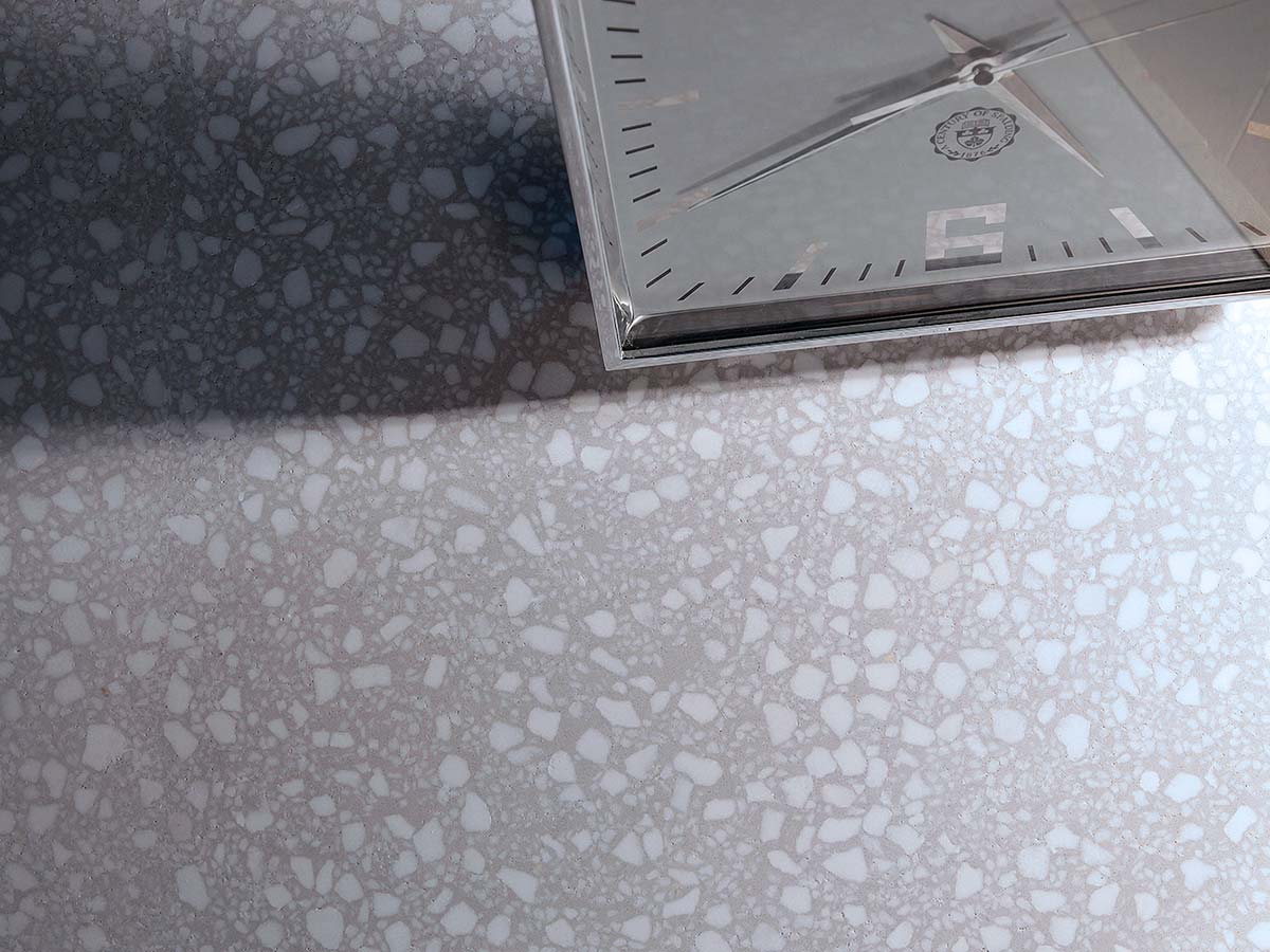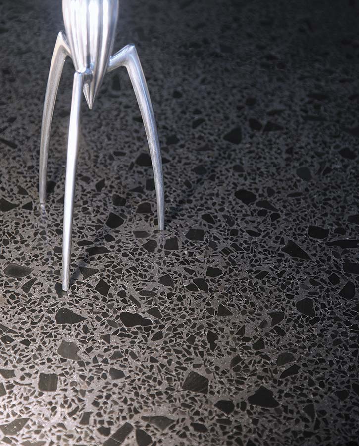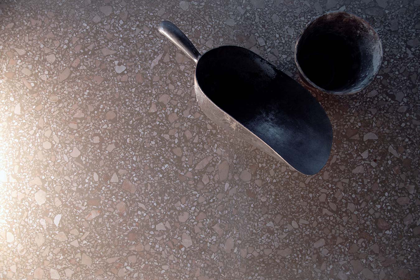Technikailag ez is terrazzo-alapú, de a kavics- és granulátum-összetétele egyfajta fragmentált, „töredékes” érzést kelt, mintha több korból, vagy különböző kődarabokból raknák össze a felületet.