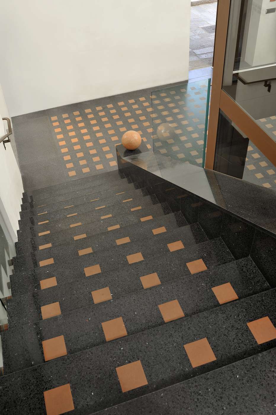 A GRANDIETTI terrazzo nem csupán egy egységes felület, nem is egyszerű alap és nem is fókusz képző pont a burkolattervezésben, hanem egy egyedi mintaképző eszköz, egy olyan grafikai elem, amely meghatározza a tér ritmusát és irányait.