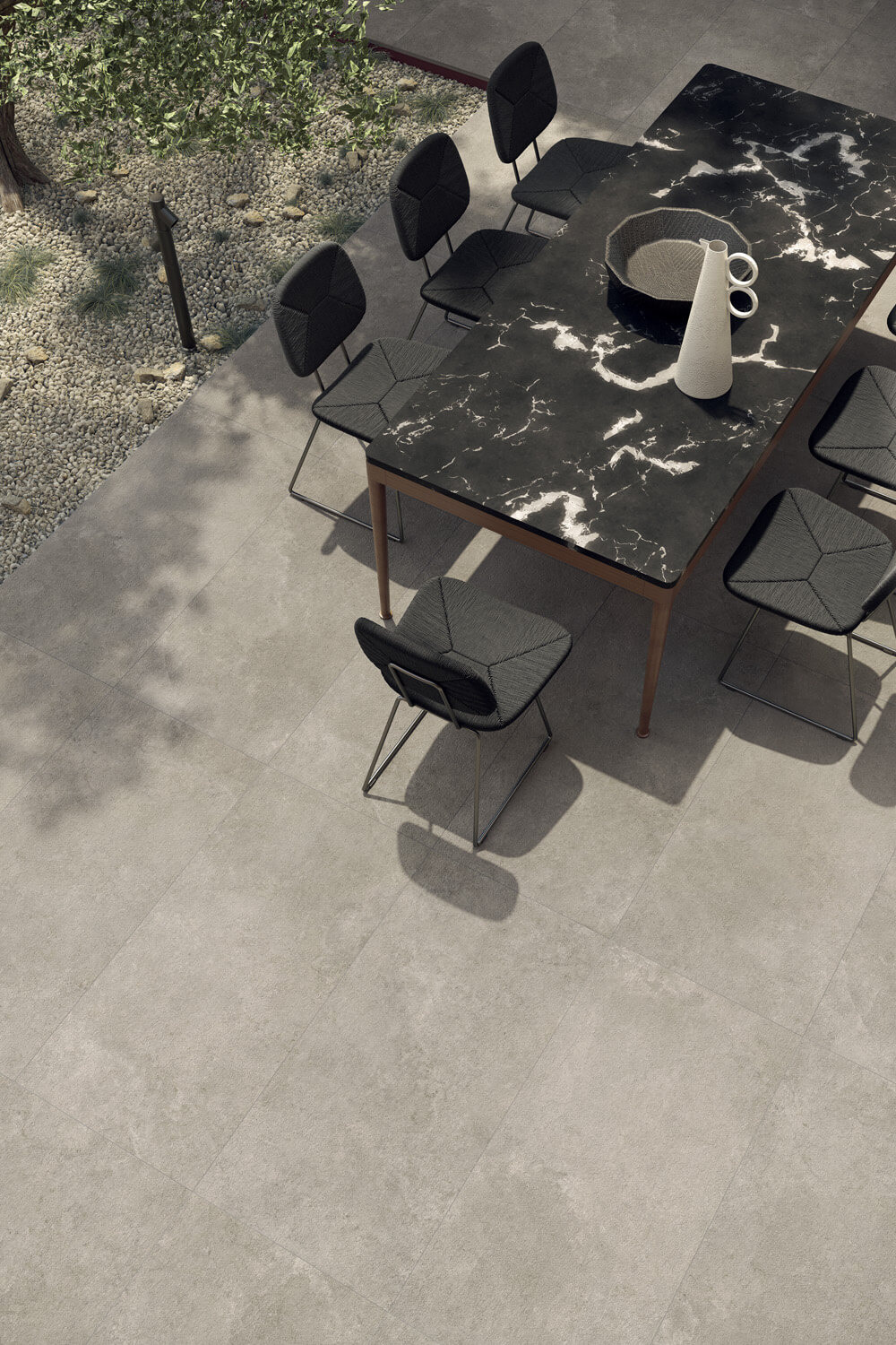 E mellett létezik a Solaris családnak egy önálló, outdoor-vonala is. Ezek a 20 mm vastag kültéri, csúszásmentes (R11C) bocciardato lapok a teraszokhoz, járdákhoz, valamint a medencék környékére készültek, és logikus folytatásai annak a beltérben megkezdett designak, amivel egységes vizuális stílust adható a ház teljes külső és belső tereinek.
