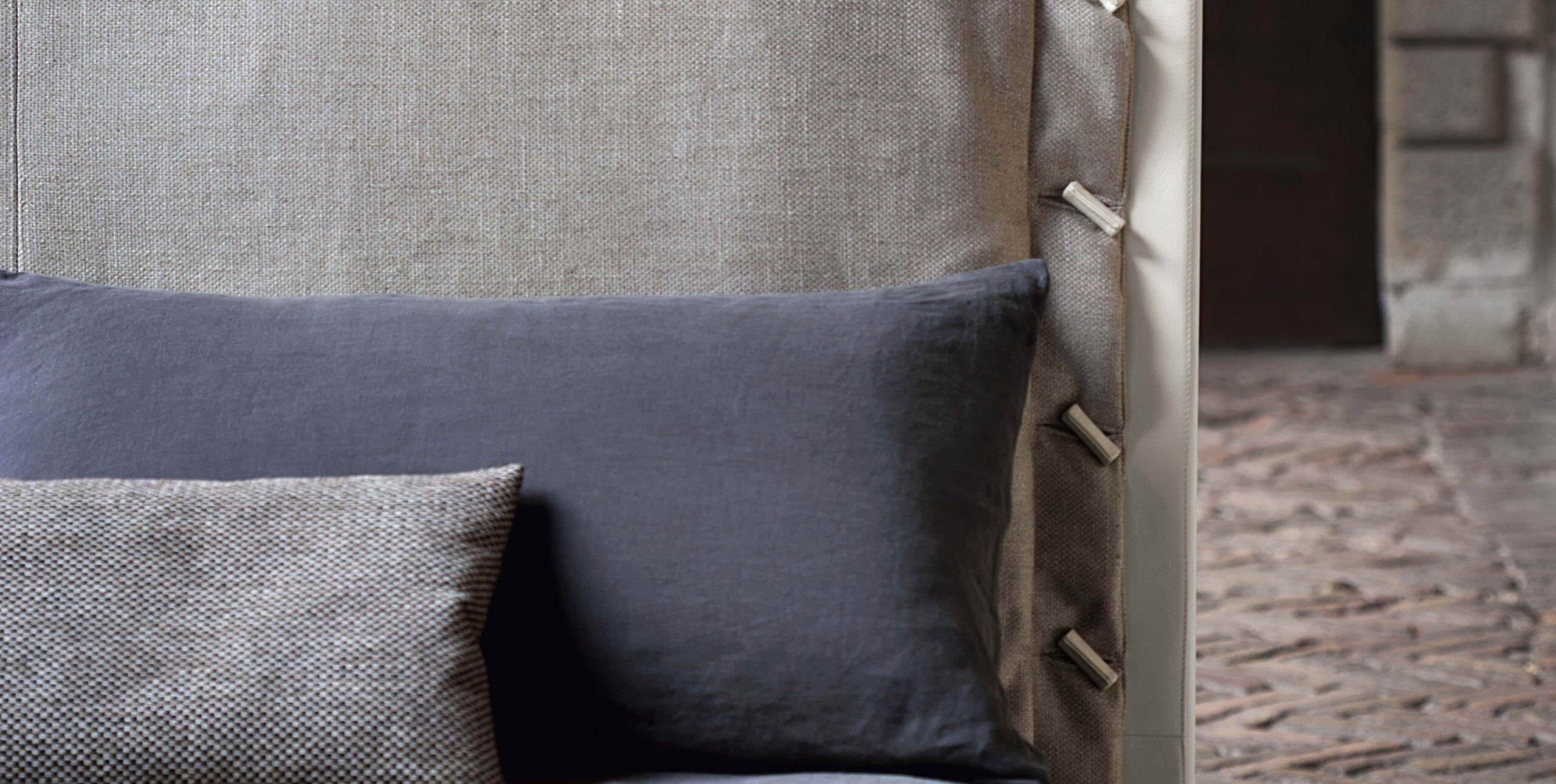 A nagy párnák és bőrcsíkok által keltett üres területek nyugodt egyensúlyt árasztanak, minden felesleges részlettől mentes, természetes eleganciával.