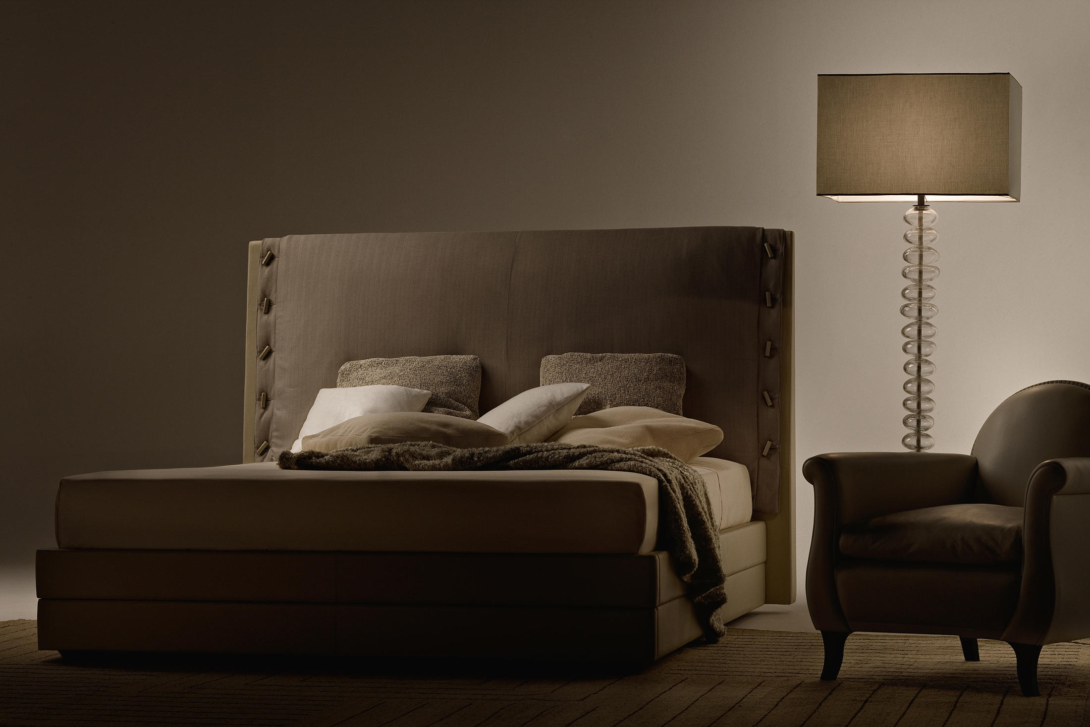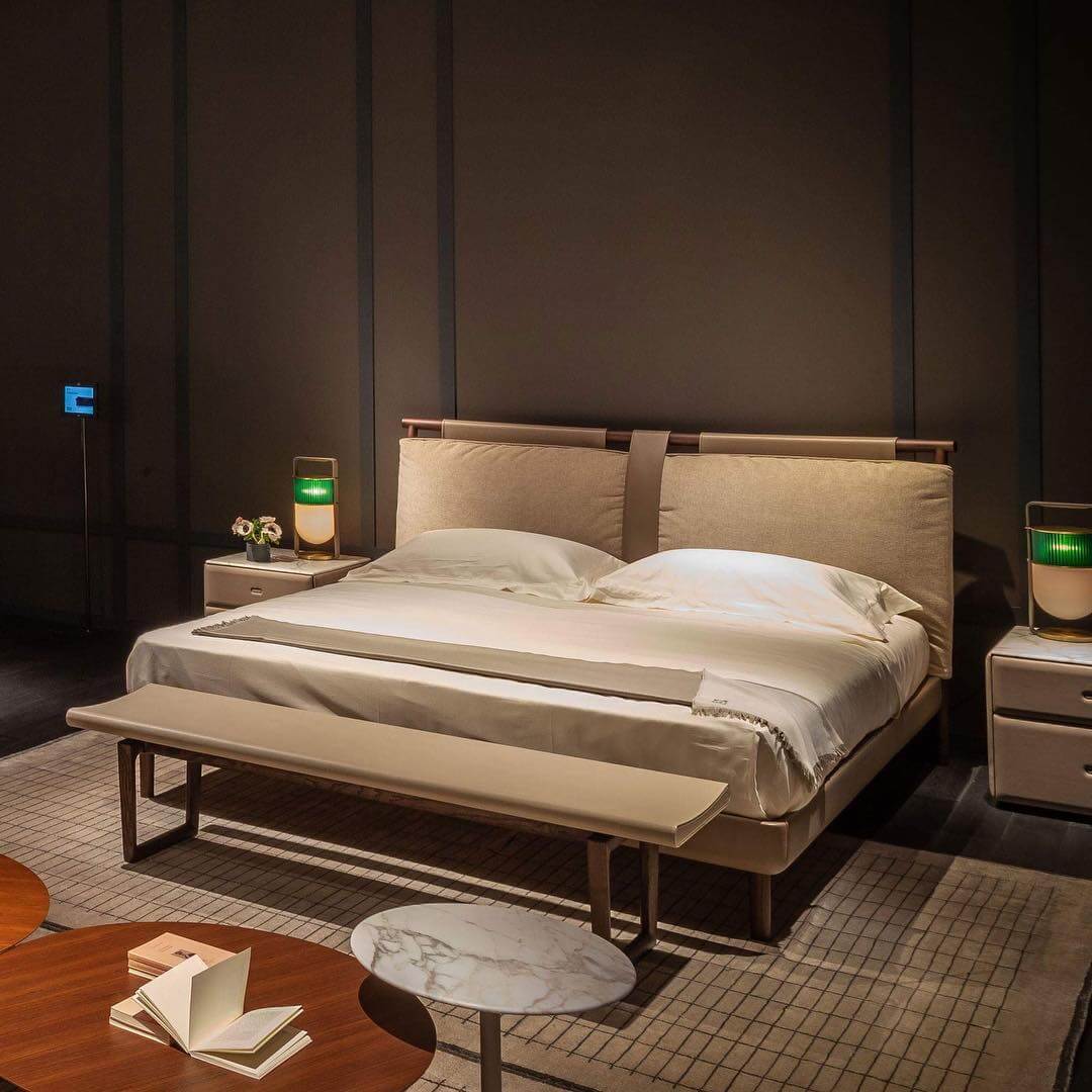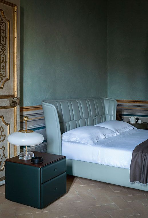 Az ágy minden részlet eleganciát sugároz. A Tone-in-tone Pelle Frau® bőrkárpit az ágy teljes egészét, az ágykeret külső és belső részét, a háttámla hátsófelületét, de még a kecses henger alakú lábakat is beborítja.