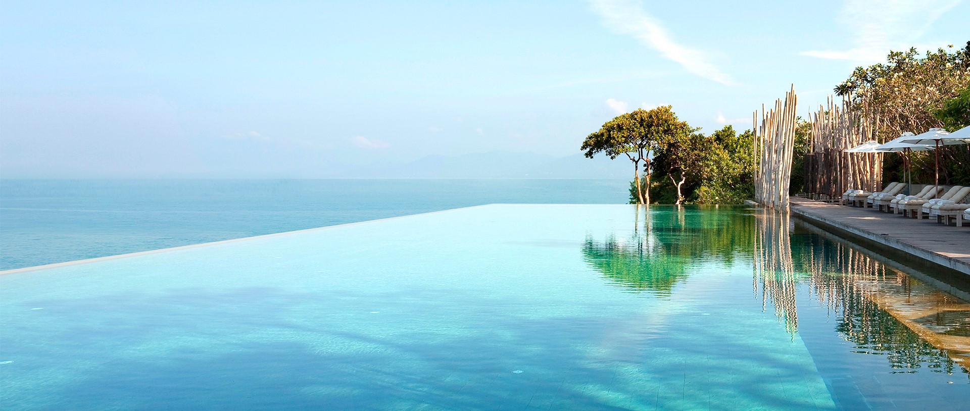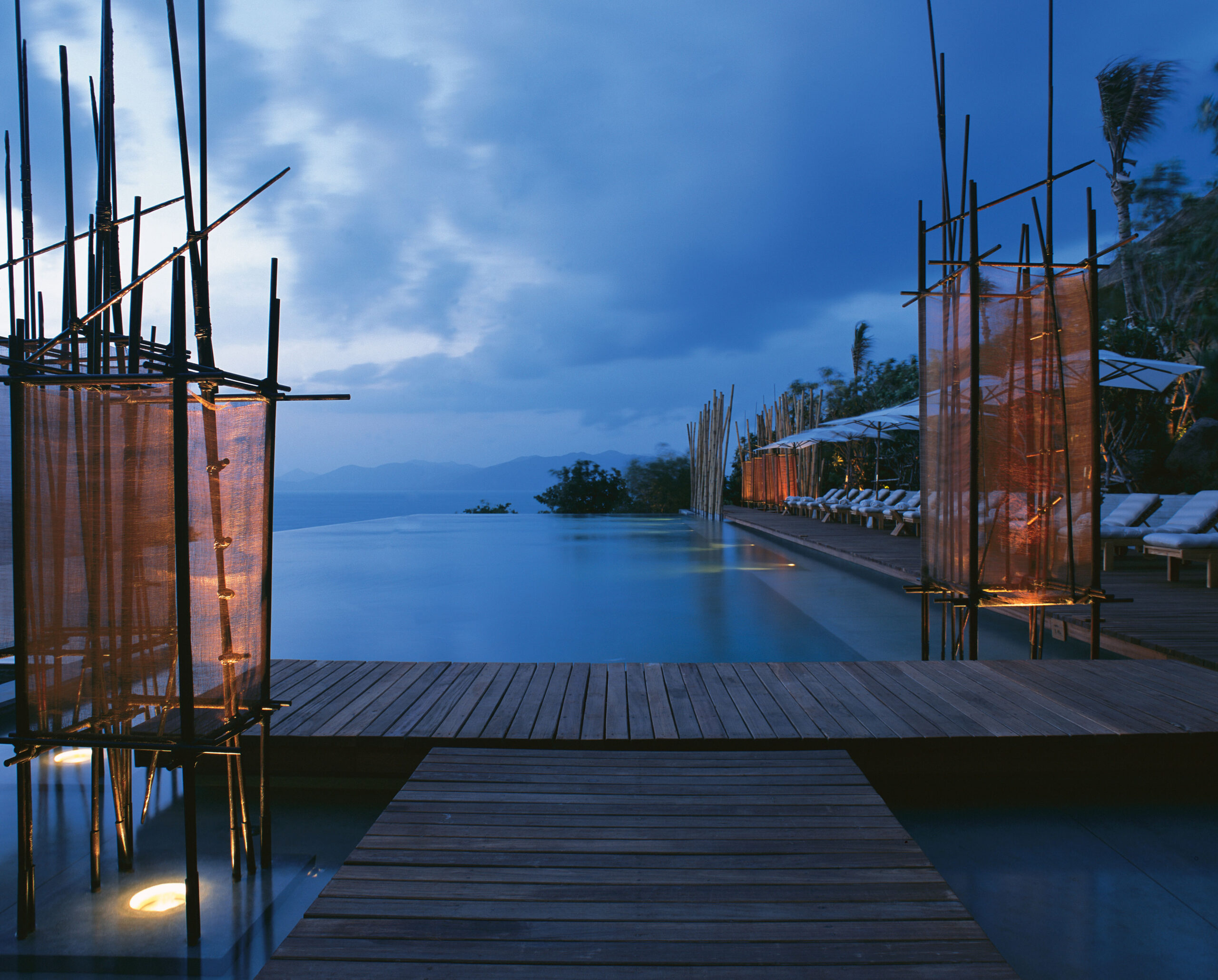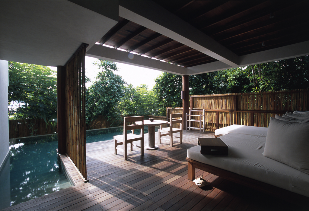 Míg a medencéből minimalista műalkotásként hatalmas bambuszok nyúlnak a végtelen ég felé, addig annak szélen régi thai halászeszközök állnak, így kapcsolva össze a múlt hagyományát, a jelenkor ultramodern építészetével.